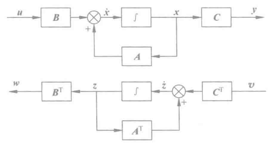 对于两个系统 Σ1:{x˙y=Ax+Bu=Cx , Σ2:{z˙w=ATz+CTv=BTz,其中 x 与 z 的维度相同,u 与 v 的维度相同,y 与 w 的维度相同,这两个系统即是对偶系统。